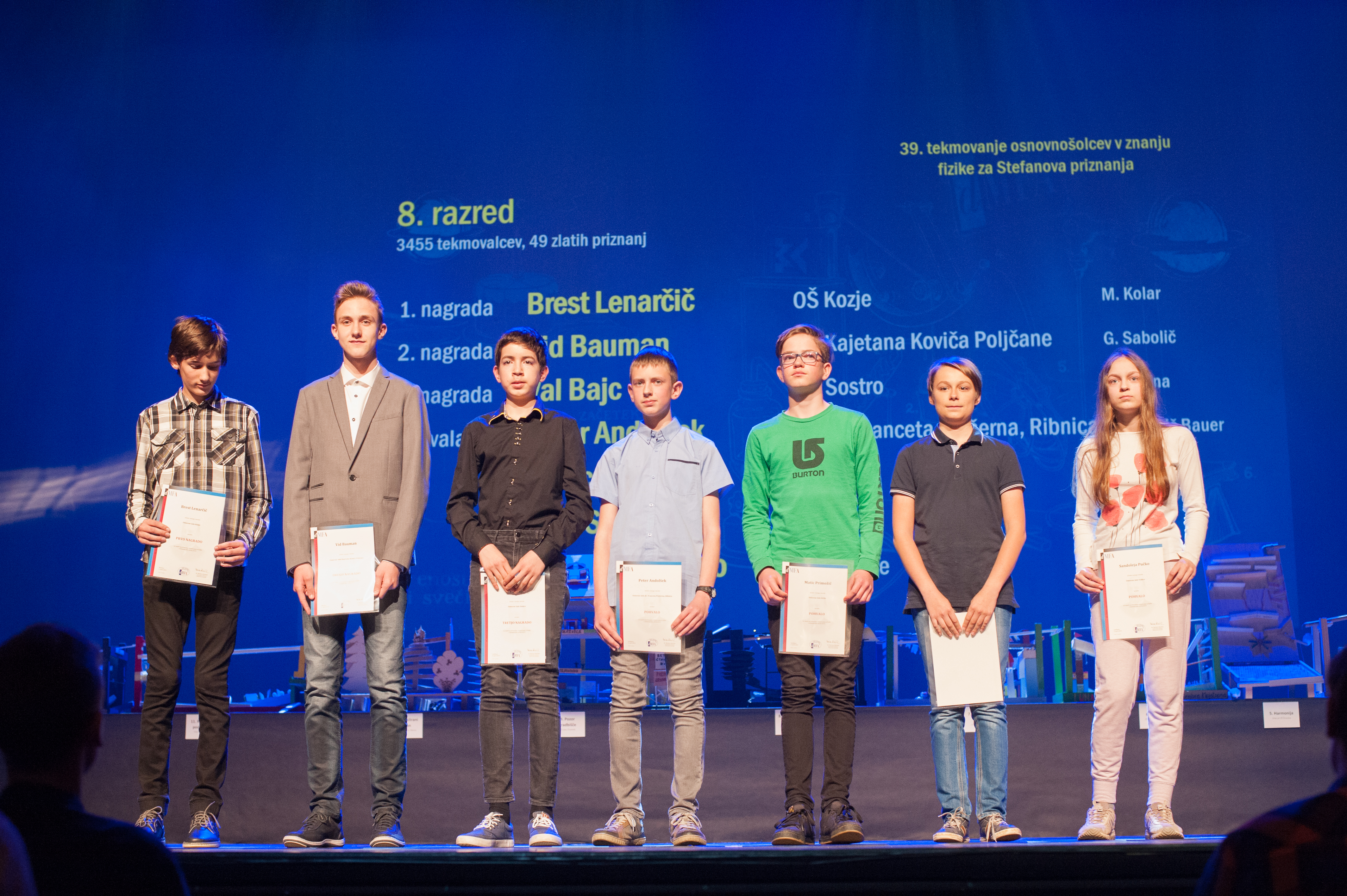 V nedeljo, 19. maja 2019, je v Cankarjeve domu potekala slavnostna prireditev Bistroumi 2019, na kateri smo nagrajencem vseh naših tekmovanj podelili nagrade za osvojena najvišja mesta na teh tekmovanjih. Med njimi tudi osmo- in devetošolcem, ki so zmagovalci letošnjega državnega tekmovanja v znanju fizike. Čestitamo še enkrat!