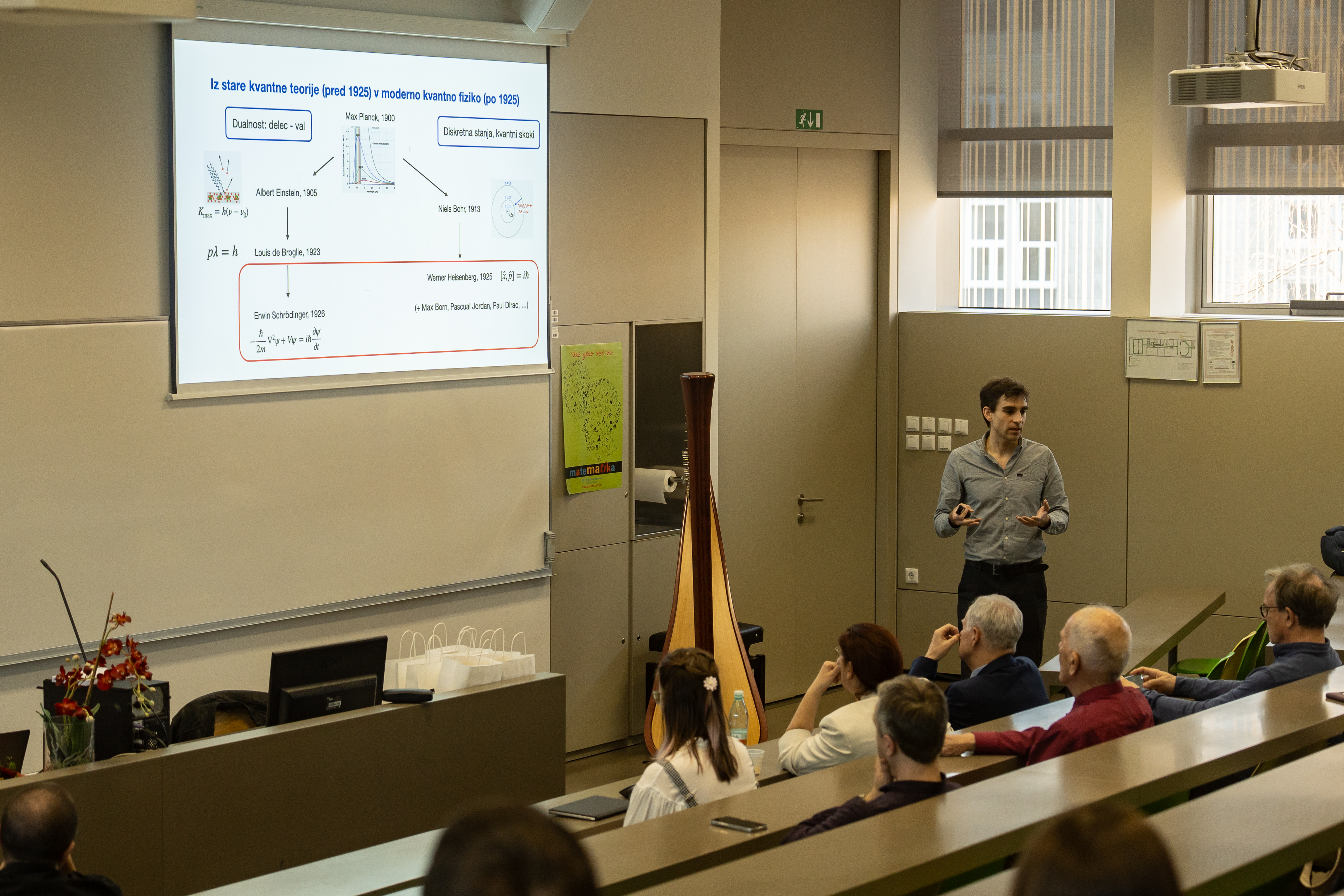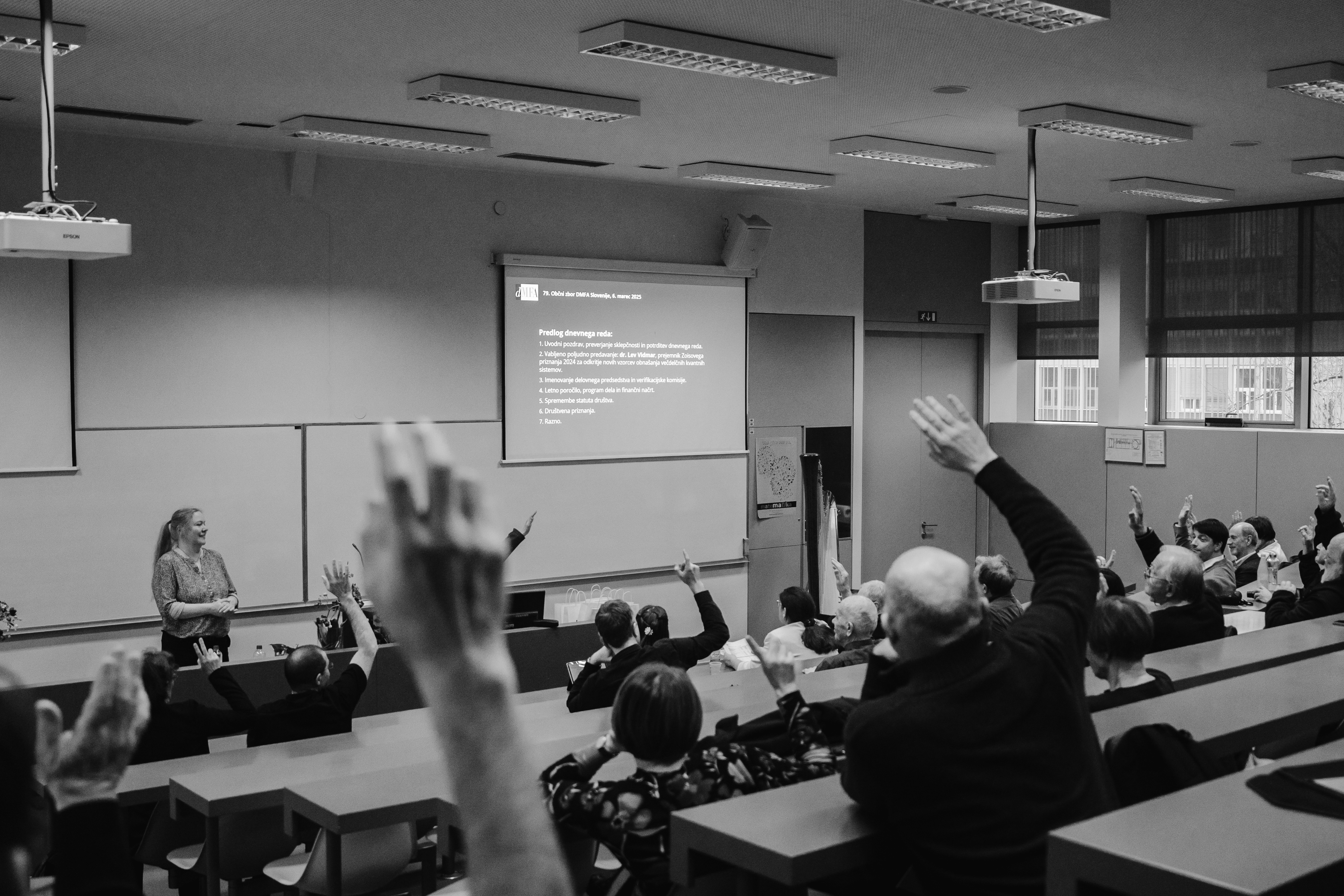 79. občni zbor društva DMFA Slovenije je potekal v četrtek, 6. marca 2025 v Vidavovi predavalnici na Fakulteti za matematiko in fiziko v Ljubljani. Po kratkem pozdravu predsednice društva dr. Mojce Vilfan smo kljub lepo napolnjeni predavalnici hitro ugotovili, da se ni zbrala vsaj polovica vseh članov društva, zato smo v skladu s tradicijo odložili pričetek občnega zbora za pol ure in pred kateder povabili posebnega gosta. Dr. Lev Vidmar, prejemnik Zoisovega priznanja 2024 za odkritje novih vzorcev obnašanja večdelnih kvantnih sistemov, nas je s poljudnim predavanjem Kvantna fizika nekoč in danes: od enega do mnogo delcev odpeljal skozi kratko zgodovino v sodobno stanje kvantne fizike.