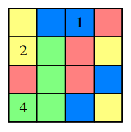 V n × n kvadratkov je potrebno vpisati naravna števila od 1 do n tako, da bo v vsaki vrstici, v vsakem stolpcu in v kvadratkih iste barve zapisanih vseh n števil.