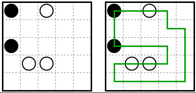 Kroge (bisere) je potrebno med seboj povezati v zanko. Črta mora teči skozi beli biser, na polju pred ali za biserom (lahko na obeh) pa mora zaviti.