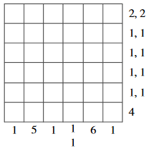 Kvadratke v razpredelnici moraš pobarvati sivo tako, da bo zaporedje sivih pasov v vrstici ustrezalo zaporedju števil na desni in da bo zaporedje sivih pasov v stolpcu ustrezalo zaporedju števil pod njim.