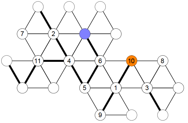 Povezati je potrebno dve oglišči poliedra, ki je podan z mrežo. Poiskati moramo pot od oranžne do modre točke. Iz ene točke lahko gremo do druge točke, če je med njima debelejša črta ali pa točki predstavljata isto oglišče poliedra.