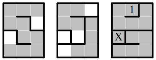 Kvader sestoji iz vodoravnih slojev kockastih oddelkov (zgornji, srednji in spodnji sloj so dani od leve proti desni). Odebeljene črte preprečujejo prehajanje med sosednjima oddelkoma istega sloja. Med oddelkom in oddelkom neposredno pod njim lahko prehajamo, če in samo če je prvi pobarvan belo. Poišči najkrajšo pot od oddelka z 1 do oddelka z X!