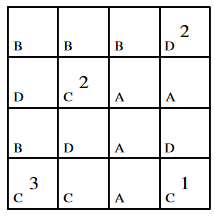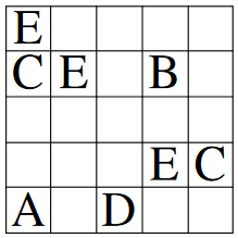 V n × n kvadratkov je potrebno vpisati naravna števila od 1 do n tako, da bo v vsaki vrstici, v vsakem stolpcu in v kvadratkih z isto črko zapisanih vseh n števil.