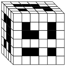 Dan je kvader, ki sestoji iz kockic. Odstranimo vse kocke, ki so zaznamovane črno od vrha do dna, od leve do desne in od spredaj do zadaj. Koliko kock smo odstranili?